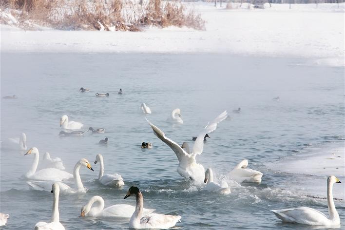 正说着,几只天鹅忽然展翅而起,洁白的羽翼在阳光下泛着莹润的光泽,掠过水面时激起圈圈涟漪。它们时而低空滑翔,时而轻盈踏水,引颈长鸣之声清脆悦耳,仿佛在呼朋引伴。河面上还游着不少野鸭,与天鹅和睦共处,时而潜入水中,时而浮出水面,为这幅冬日画卷增添了更多生趣。