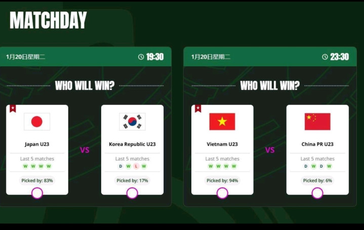 另一场半决赛的投票同样呈现一边倒的态势,83%的球迷预测日本U23会战胜韩国U23。绝大多数球迷心中,本届U23亚洲杯的决赛舞台,早已提前锁定越南与日本的对决。